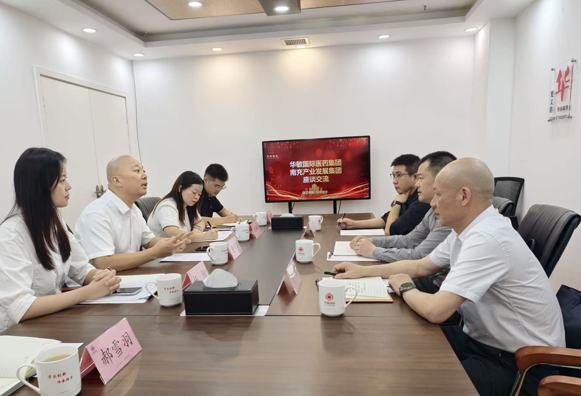 2025年9月25日,南充产业发展集团有限公司总经理黄孝红、副总经理杨麟,南充市中小企业和农业产业化融资担保有限公司副总经理陈一鑫一行莅临华敏国际医药集团交流座谈。