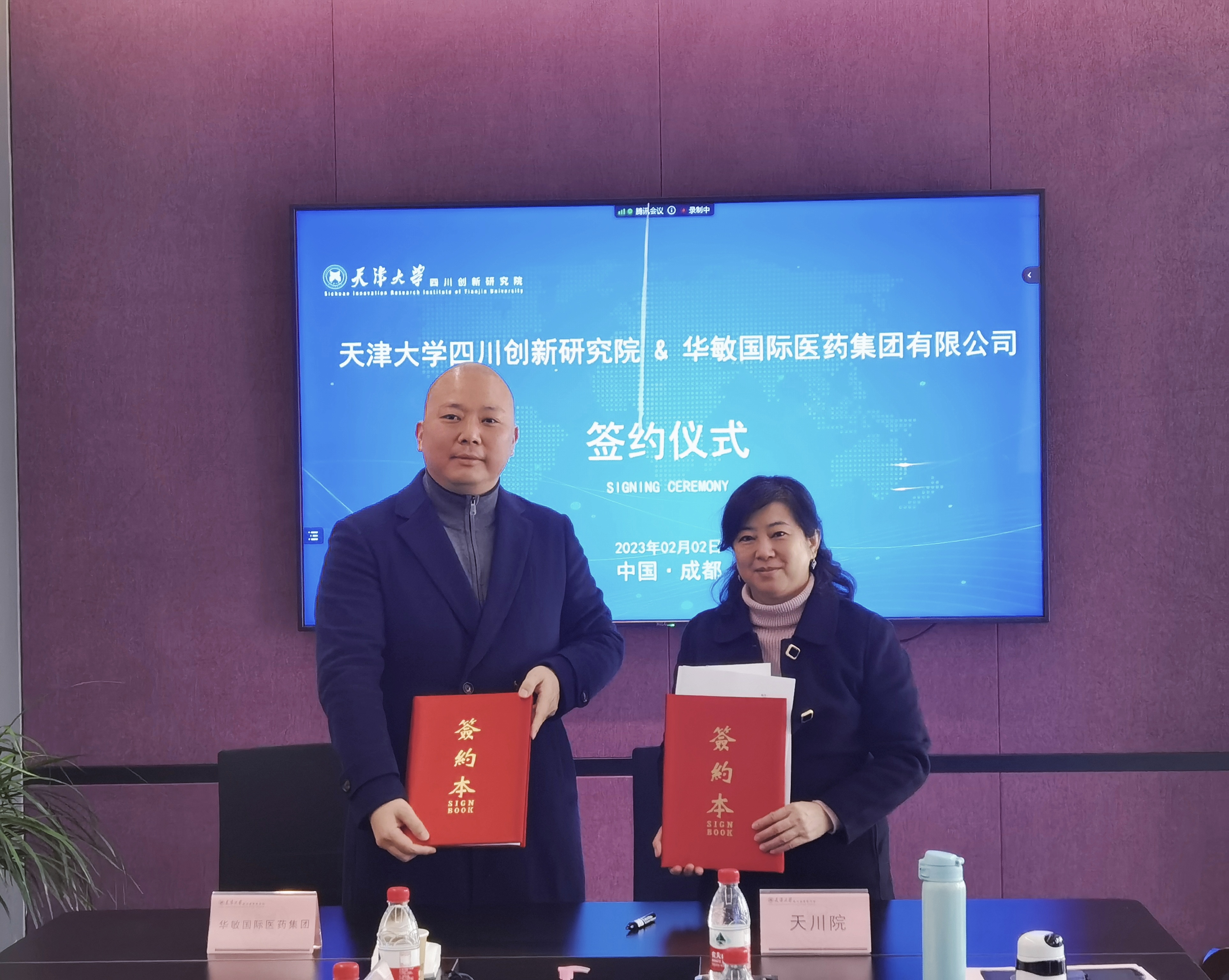 2023年2月2日,天津大学四川创新研究院(简称:天川院)与华敏国际医药集团有限公司在天川院内举行战略合作签约仪式。